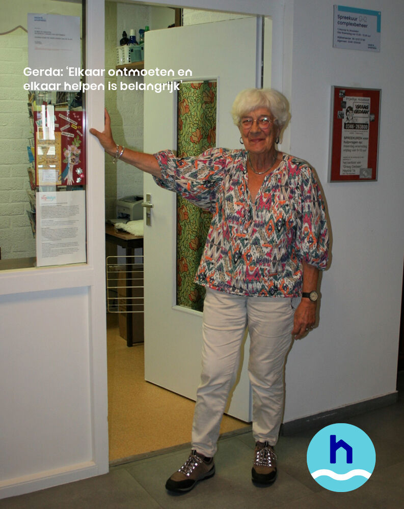 Gerda Emke is al meer dan 30 jaar vrijwilliger voor Graag Gedaan. Deze hulpdienst heeft een eigen kantoortje in de hal van ’t Heycop. Gerda: “Fijn dat we nu hier zitten, want we hebben alleen persoonlijk of telefonisch contact met de bewoners. We hebben geen website of online diensten. Mensen kunnen hier een aanvraag indienen. Meestal gaat het om vervoer of boodschappen. We zetten dan vrijwilligers in, die tegen een kleine betaling (kilometervergoeding) kunnen helpen. Heel belangrijk om elkaar op deze manier te helpen. En het geeft me ook energie.”